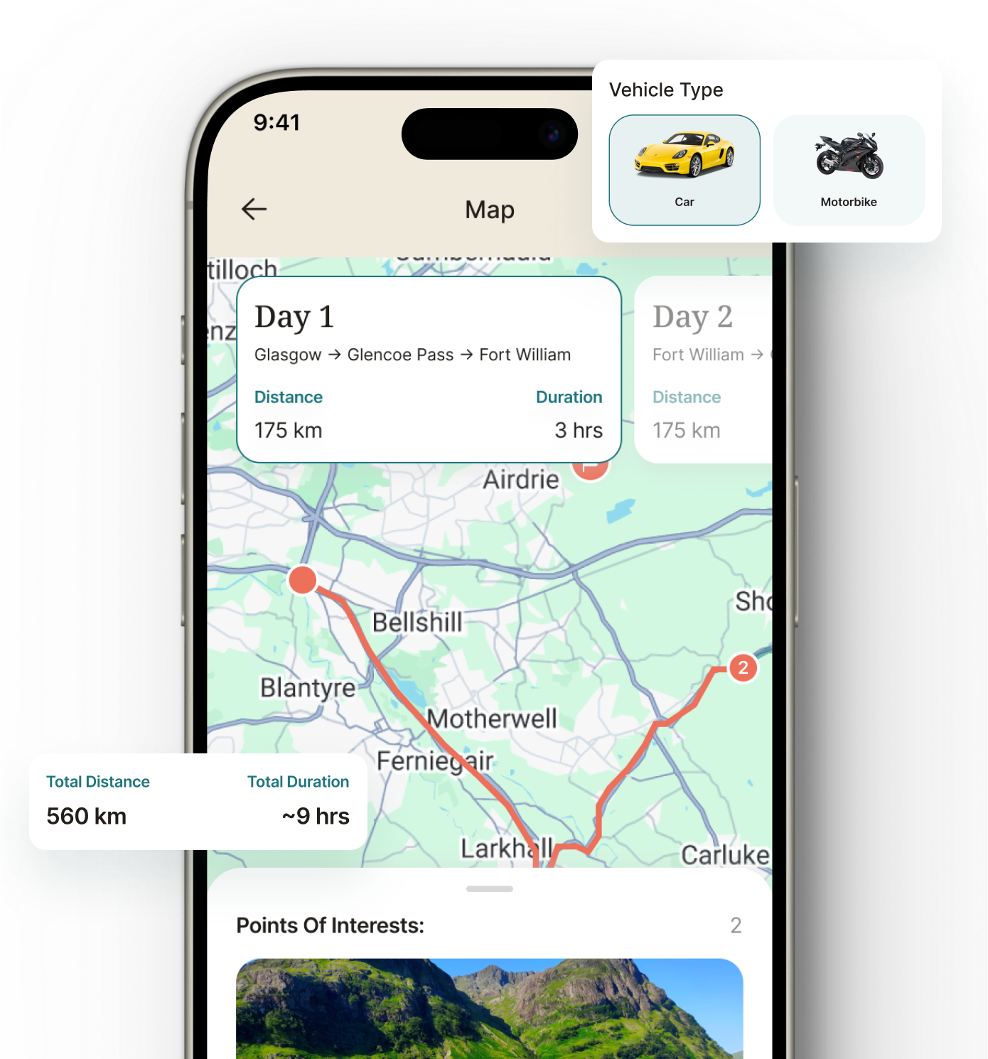 Create and plan your ideal road trip based on your interests and budget. Customise your itinerary and get recommendations for places to visit or events to attend along the way.